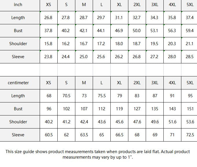 | inch | XS | S | M | L | XL | 2XL | 3XL | 4XL | 5XL |